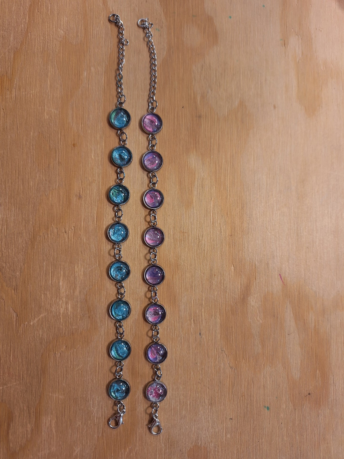 Elevate your accessory game with our playful link bracelet boasting 8 hand-painted pendants, sealed with glass and glaze for long-lasting shine. The clasp closure adds the perfect finishing touch to this dainty and lightweight piece.