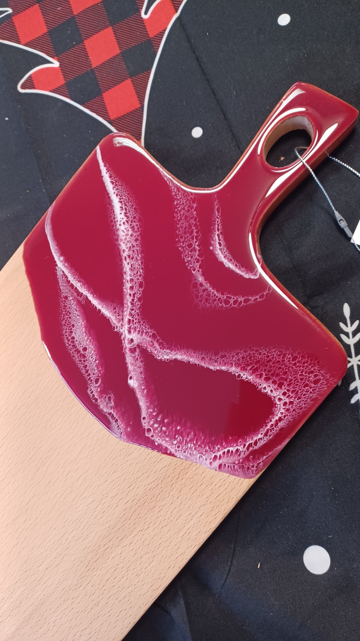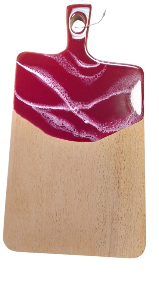 Epoxy resin on wood. 14"x .5"x 7.5". Resin is heat, water and scratch resistant. However, please refrain from placing high heat directly on surface as it will soften the resin. Resin can be wiped with a dry or damp cloth.