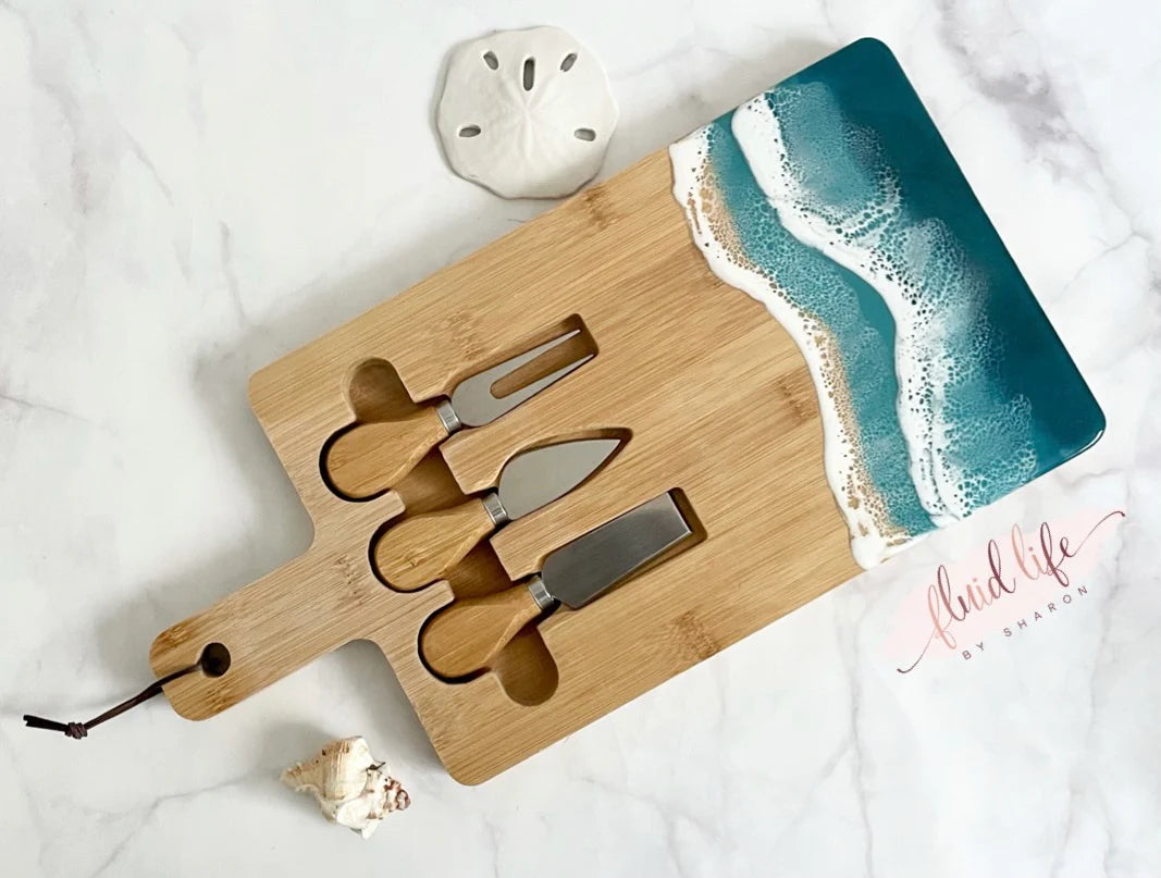 Epoxy resin on wood. 14"x .5"x 7.5". Resin is heat, water and scratch resistant. However, please refrain from placing high heat directly on surface as it will soften the resin. Resin can be wiped with a dry or damp cloth.